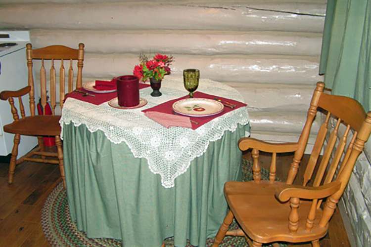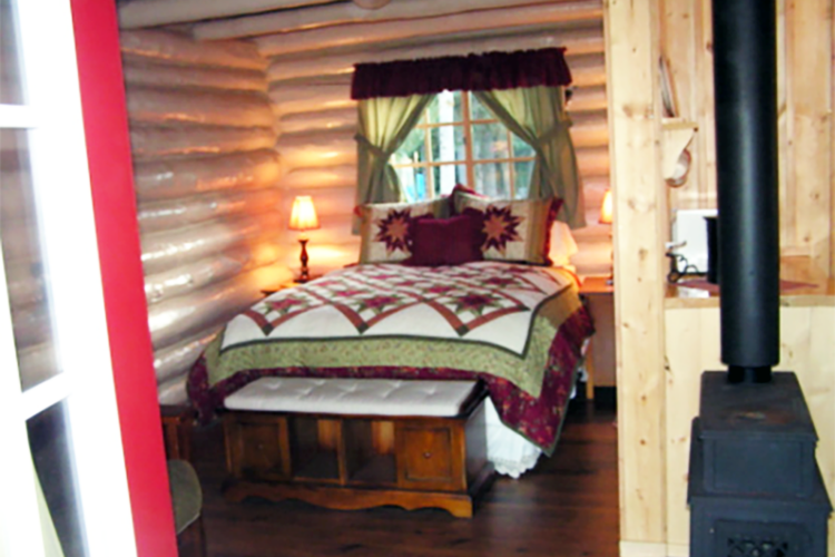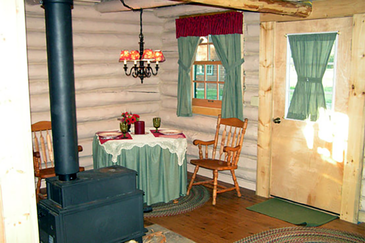 The original cabin logs and deck are still in place. Looking closely, you can see traces of moss and burlap used for chinking long ago. The interior has been newly chinked and updated for today’s traveler with wood flooring, a braided rug, a queen bed with down bedding, a kitchen, a bath, and a wood-burning stove.
