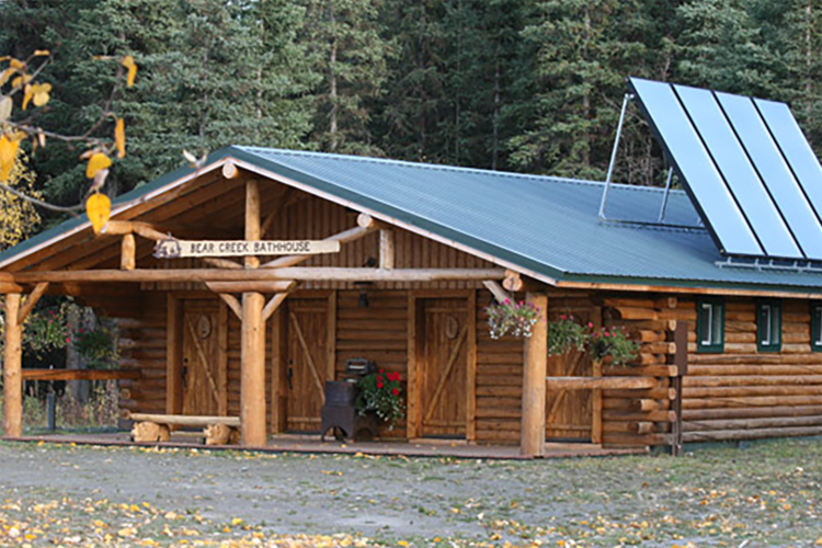 Our bathhouse is the grandest north of the 49th parallel. You’ll see why when you see it! Built in 2007, this log building is constructed from naturally aged logs downed in an Alaskan forest fire 18 years ago. The logs were peeled and hand-scribed to make an unusually beautiful camp bathhouse. With its large overhanging roof and deck, antique copper washer, rustic stalls, and light fixtures, the bathhouse has been nominated for a feature article in a log building magazine.