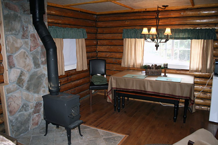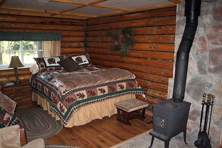 Like our other cabins, Timber Trails has the same touches of rustic luxury: wood floor, braided rug, woodburning Jotul stove with a cooking circle, and a queen-sized bed with down bedding.