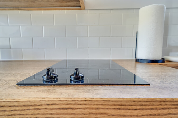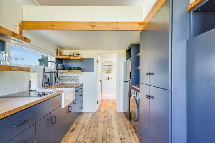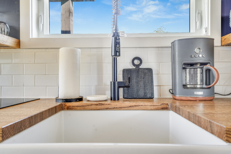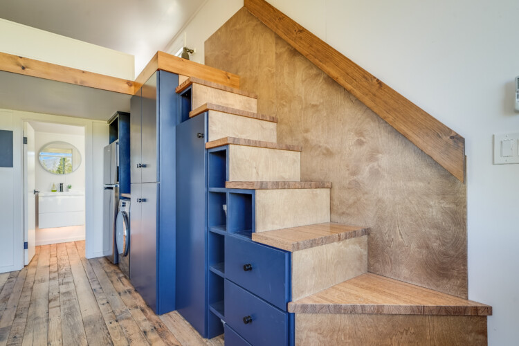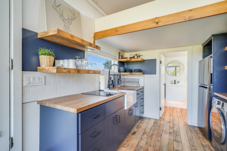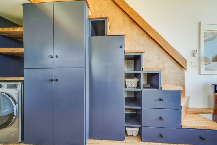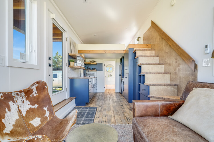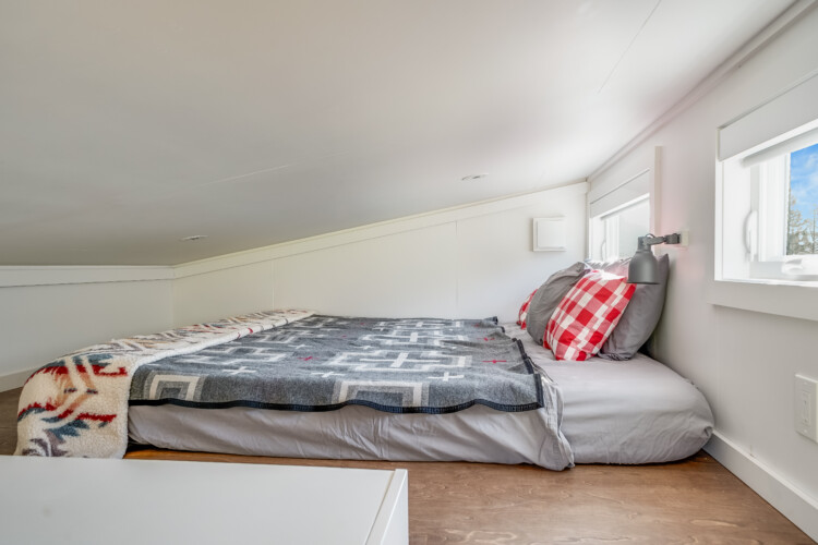 This tiny home feels anything but tiny. It is equipped with everything you would expect in a full-sized home. The bedroom boasts a king bed with a cute staircase leading up to it. Under the stairs, you will find ample storage space, a washer/dryer, and a refrigerator. The kitchen has a small stovetop, a full-size farm sink, and all the kitchen tools you need for a comfortable stay.