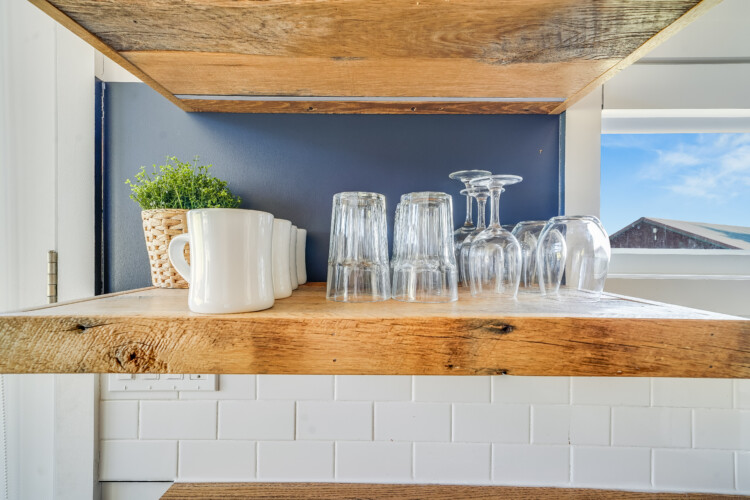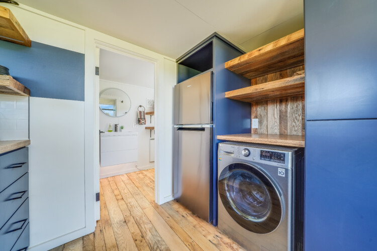 This tiny home feels anything but tiny. It is equipped with everything you would expect in a full-sized home. The bedroom boasts a king bed with a cute staircase leading up to it. Under the stairs, you will find ample storage space, a washer/dryer, and a refrigerator. The kitchen has a small stovetop, a full-size farm sink, and all the kitchen tools you need for a comfortable stay.