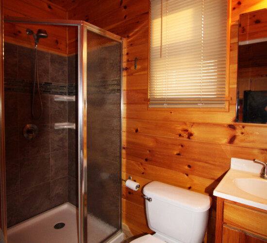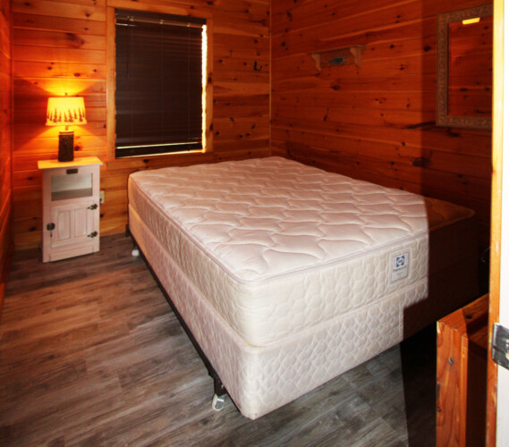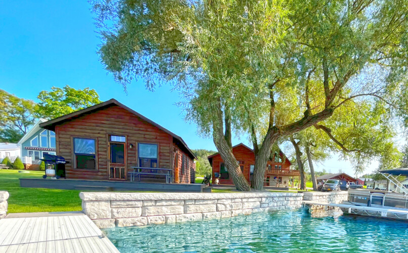 - Two identical log cabins side by side, rented separately, called the Bass and Walleye Cottages