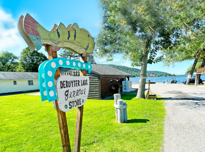 - DeRuyter Lake is a very friendly place to visit, with the General Store across the parking lot and the Boat House Restaurant also on the water, as you can see from the cottage decks. The lake is 2 miles long and a 1/2 mile wide, with an average depth of 15 1/2 feet. Over 50 feet of beachfront to place your plane. A walk around the lake is about 5 miles. You will see boaters launching and area residents coming and going to the General Store for candy, snacks, ice, marine fuel, bait and tackle, and other summer stuff. Fireworks on the water happen twice a summer, on the Fourth of July and in September for Labor Day weekend.